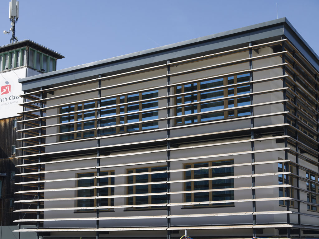 Hier zu sehen sind Lärchenhölzer in verschiedenen Ausführungen, in Verbindung mit modernster Fassadentechnik aus Glas.